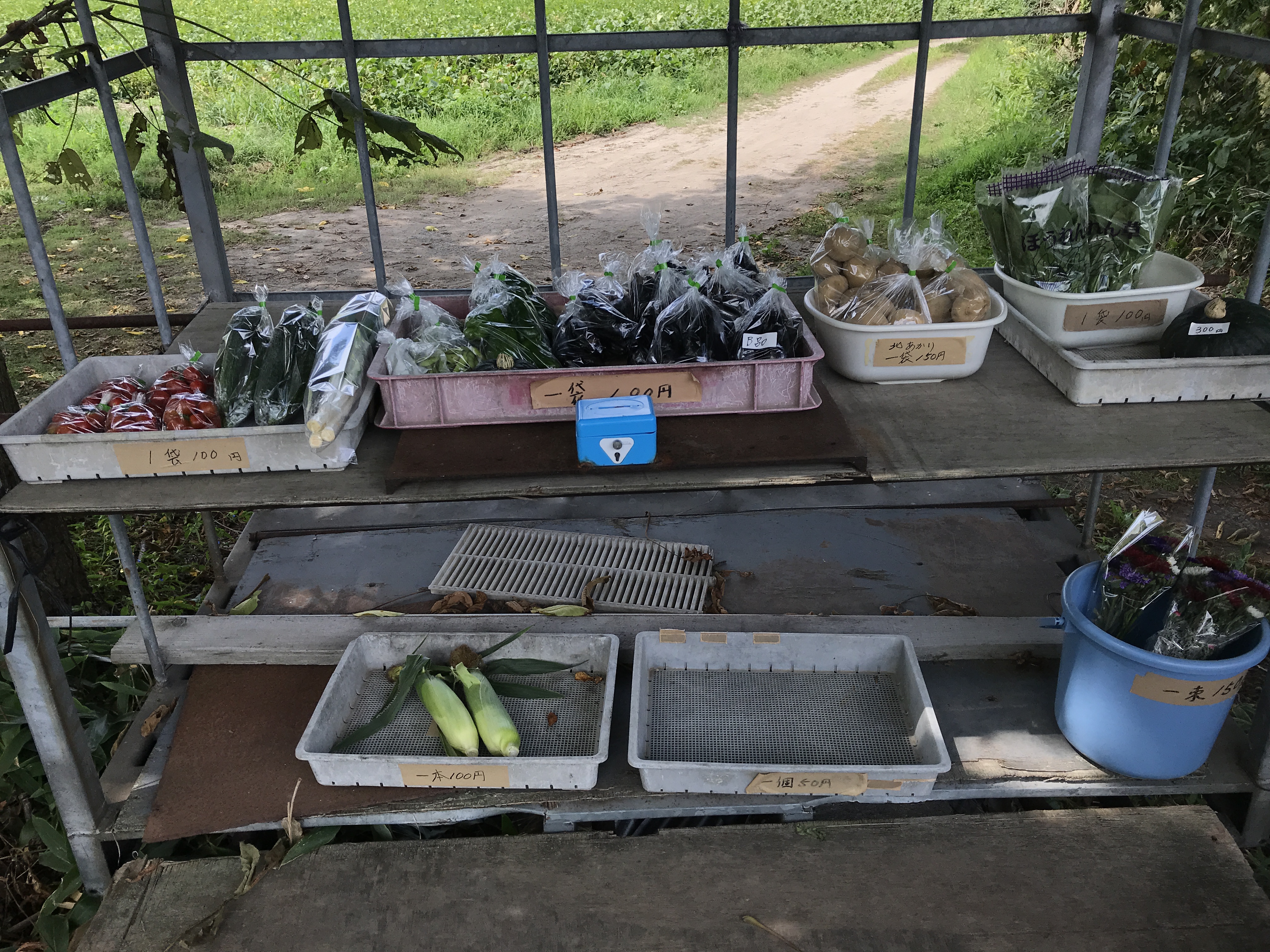 サイクリングロード沿いに情緒あふれる野菜の無人販売所があります。